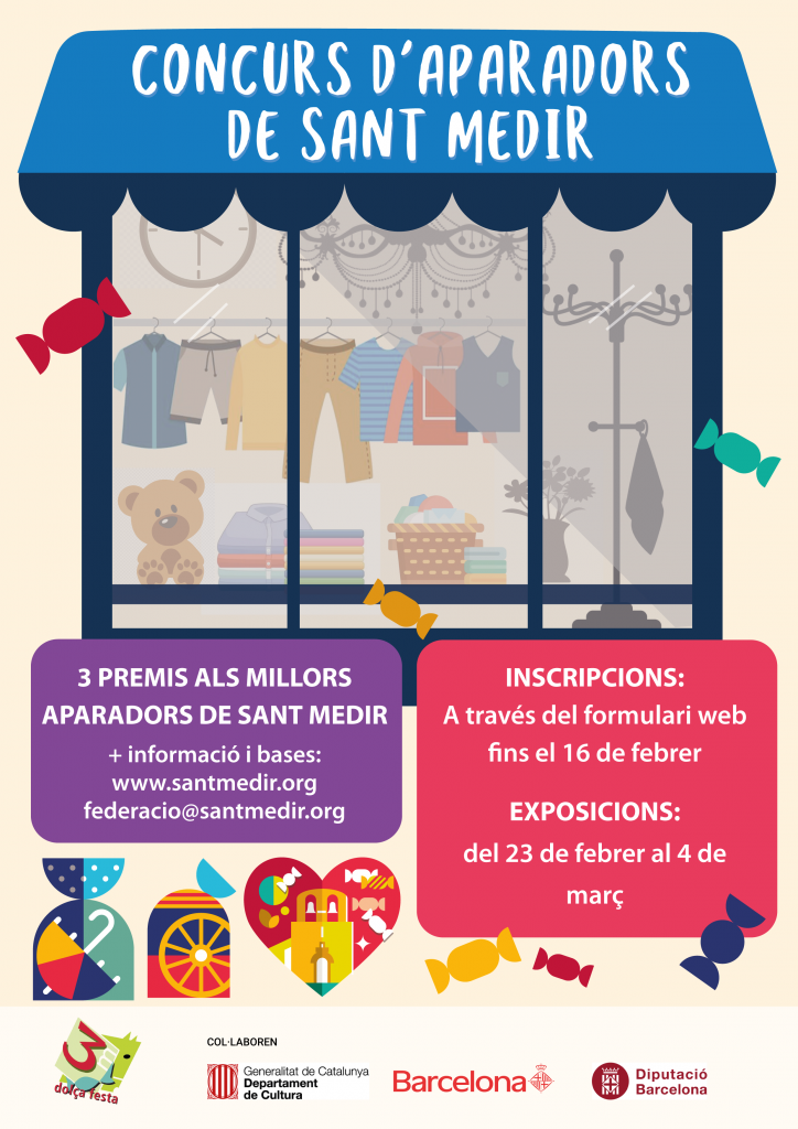 - L’aparador haurà d’estar exposat del 23 de febrer al 4 de març de 2026, ambdós dies inclosos (en el cas de Sants, podrà ser del 2 al 8 de març, adaptant-nos al calendari local). A la web de Sant Medir es publicarà una ruta per visitar tots els aparadors inscrits.