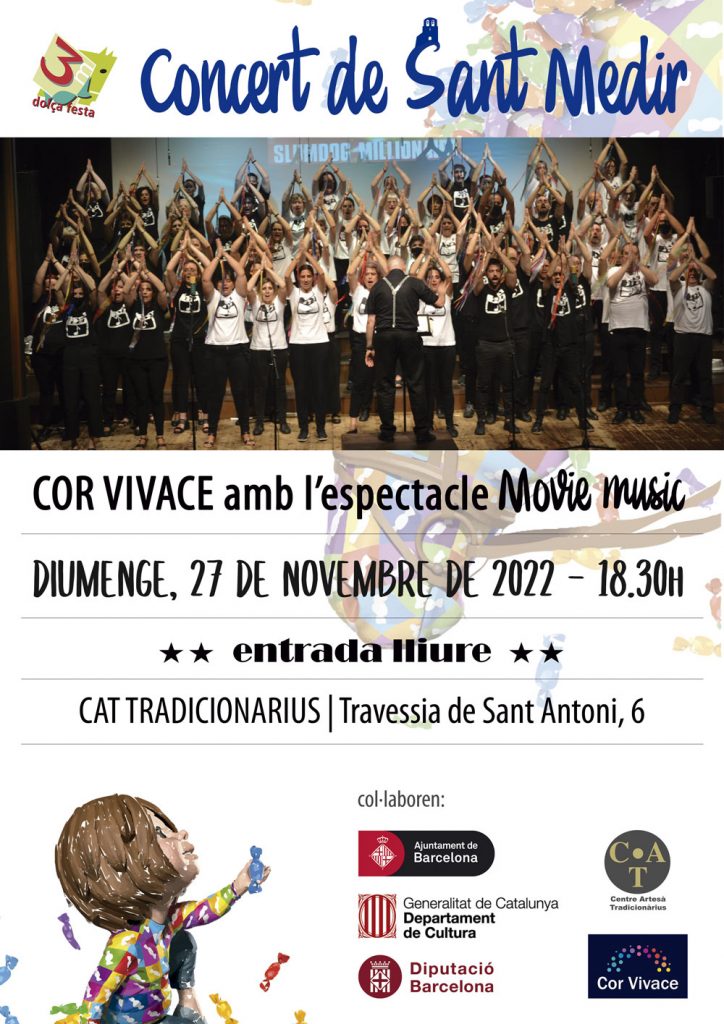 El proper 27 de novembre es celebrarà una nova edició del Concert de Sant Medir que tindrà lloc al Centre Artesà Tradicionàrius. Enguany, gaudirem de l’espectacle Movie Music que ens oferirà el Cor Vivace: