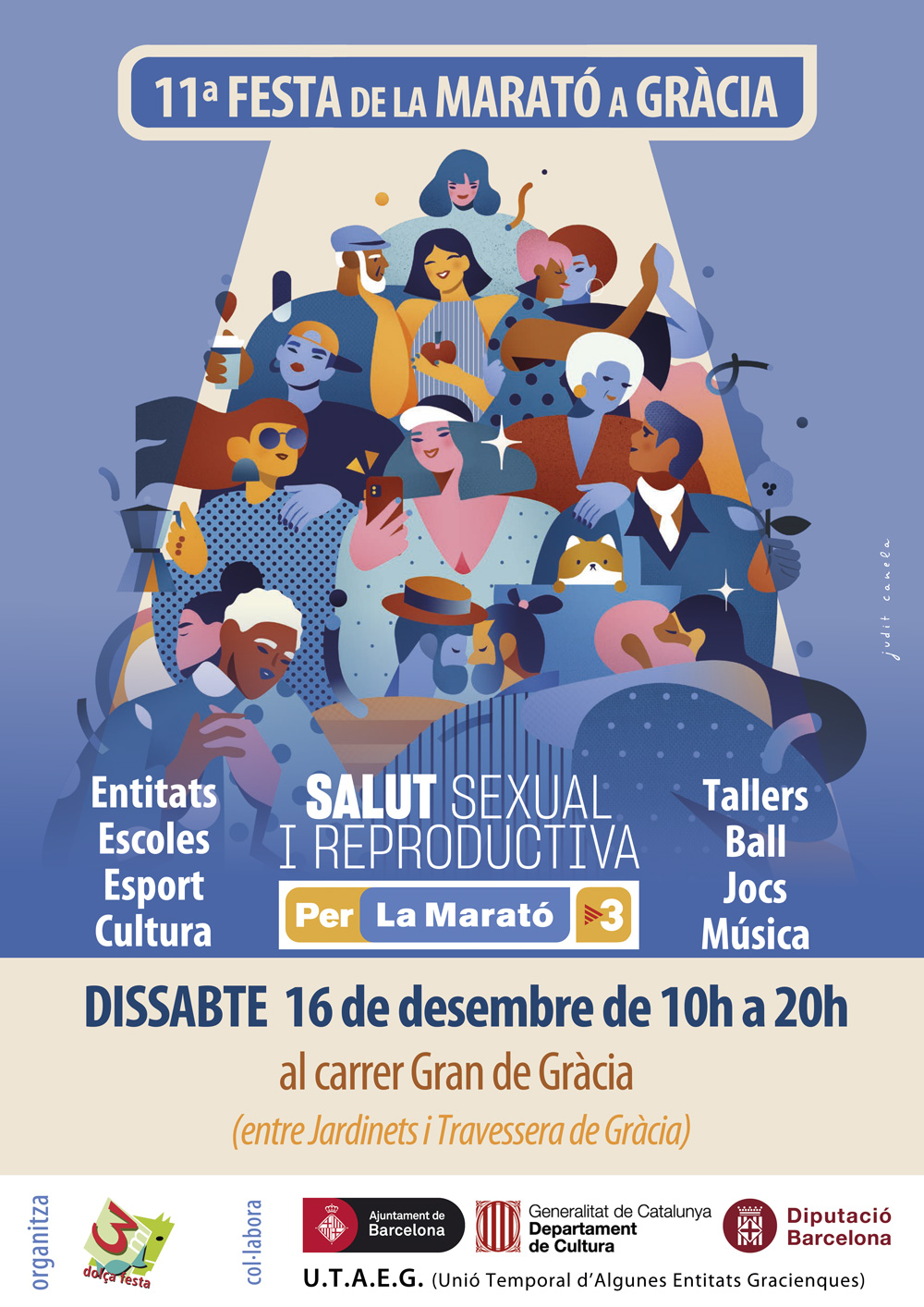 En motiu de la Marató de TV3, Gràcia se suma a l’objectiu de l’edició 2023 del projecte solidari: donar llum a la salut sexual i reproductiva, un àmbit complex i invisibilitzat sobre el qual encara pesen tabús i estigmes. Així doncs, el proper dissabte 16 de desembre, de 10h a 20h al carrer Gran de Gràcia, entre Jardinets i Travessera de Gràcia, tindran lloc tot d’activitats familiars: tallers infantils, música. ball, jocs, esport, etc.